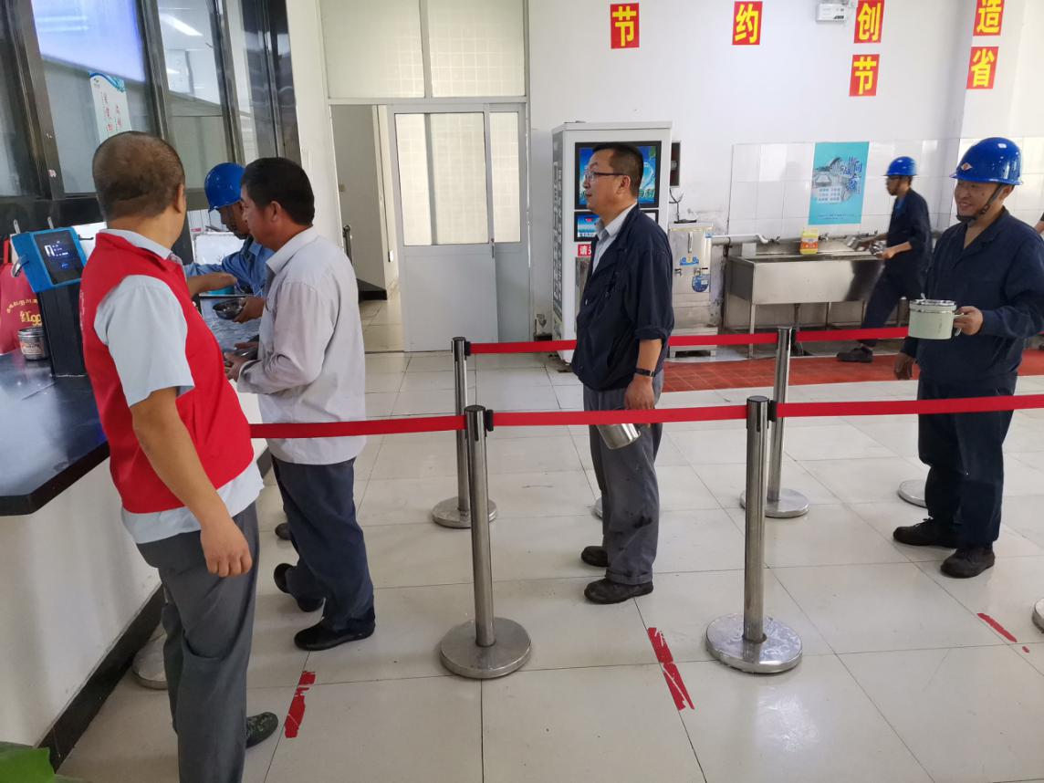 上午10:50 “文明餐桌志愿服務隊”成員已穿上紅馬甲,在職工餐廳集合,擺放好餐桌上的隔離擋板和椅子,規(guī)置好餐廳取餐窗口的警戒欄桿。11:00開飯時間到,陸續(xù)有員工到達,11:30各車間員工、外協(xié)檢修人員同時到達職工餐廳形成就餐高峰。通過“紅馬甲“的指引勸導,職工們根據(jù)飯量不同,按需打菜,垃圾桶里剩菜剩飯明顯減少,取餐窗口排隊秩序井然,單人單桌就餐或雙人隔板就餐文明規(guī)范。